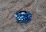 This beautiful hand-painted dot mandala tealight holder features ocean colors of blue and pearl. The pearl design is meant to suggest a seashell. It is hand-cast using a special mortar blend. Then each dot is individually painted by hand. It is sprayed with a protective clear coat. And the bottom is lined with felt to protect your furniture from scratches. It can hold any standard tealight, including flameless ones.