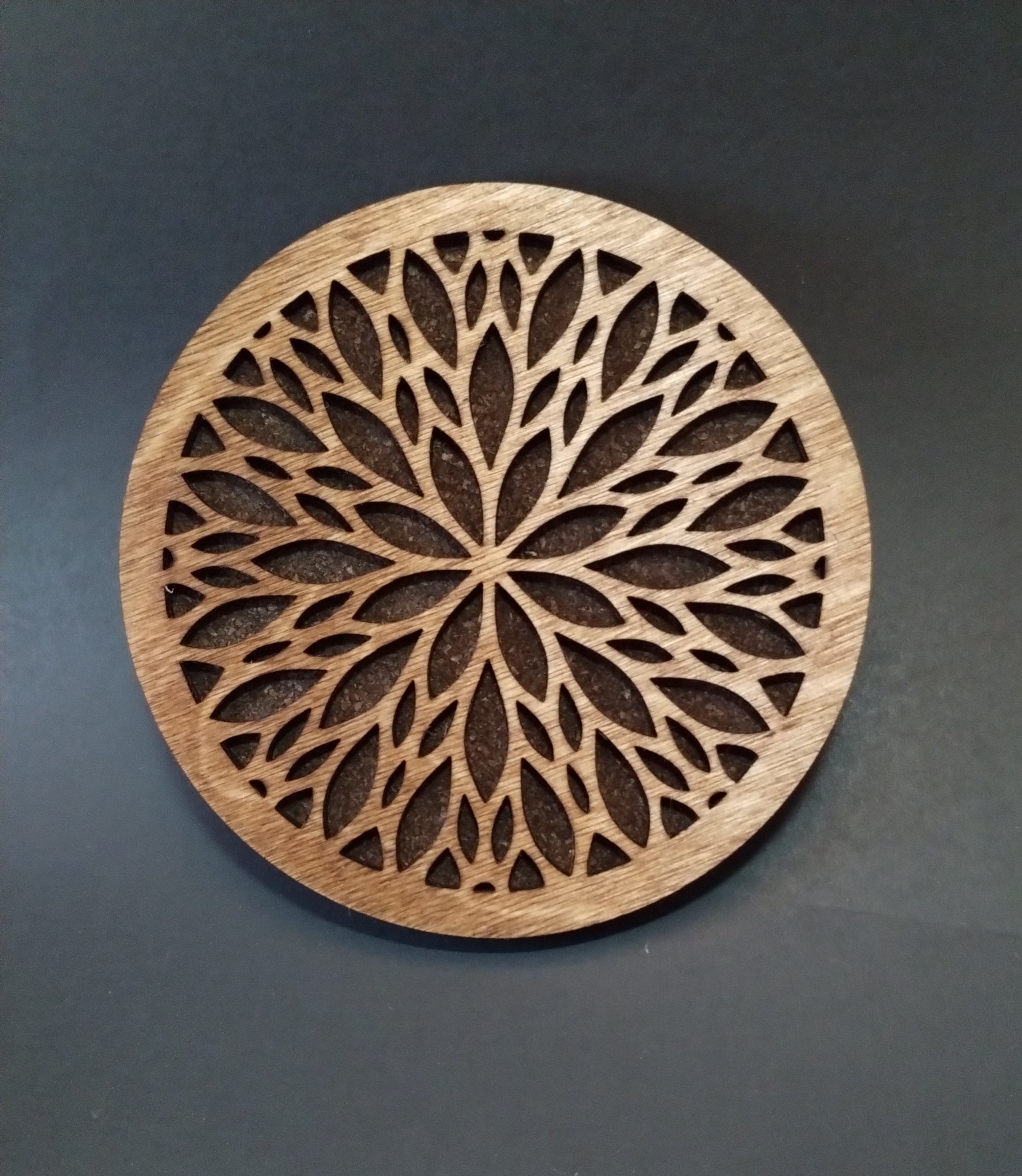 Made of birch plywood and cork, this elegant set of coasters will complement any home decor style. The wood is laser cut, then hand-finished with Danish oil to improve durability, water-resistance, and heat tolerance. It is then allowed to cure for a minimum of 30 days prior to shipping. The top and side surfaces of the cork are hand-stained with a water-based, Kona brown stain to complement and enhance the overlying wood pattern. The cork base protects furniture from scratches, watermarks and heat damage. The cut-out design holds condensation within the coaster, preventing the moisture from spilling over the sides. The design, combined with the wood grain, helps prevent glasses from sticking to the coaster. Plus, no worries about dropping and breaking the coaster since it is both lightweight and durable.