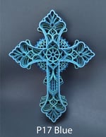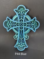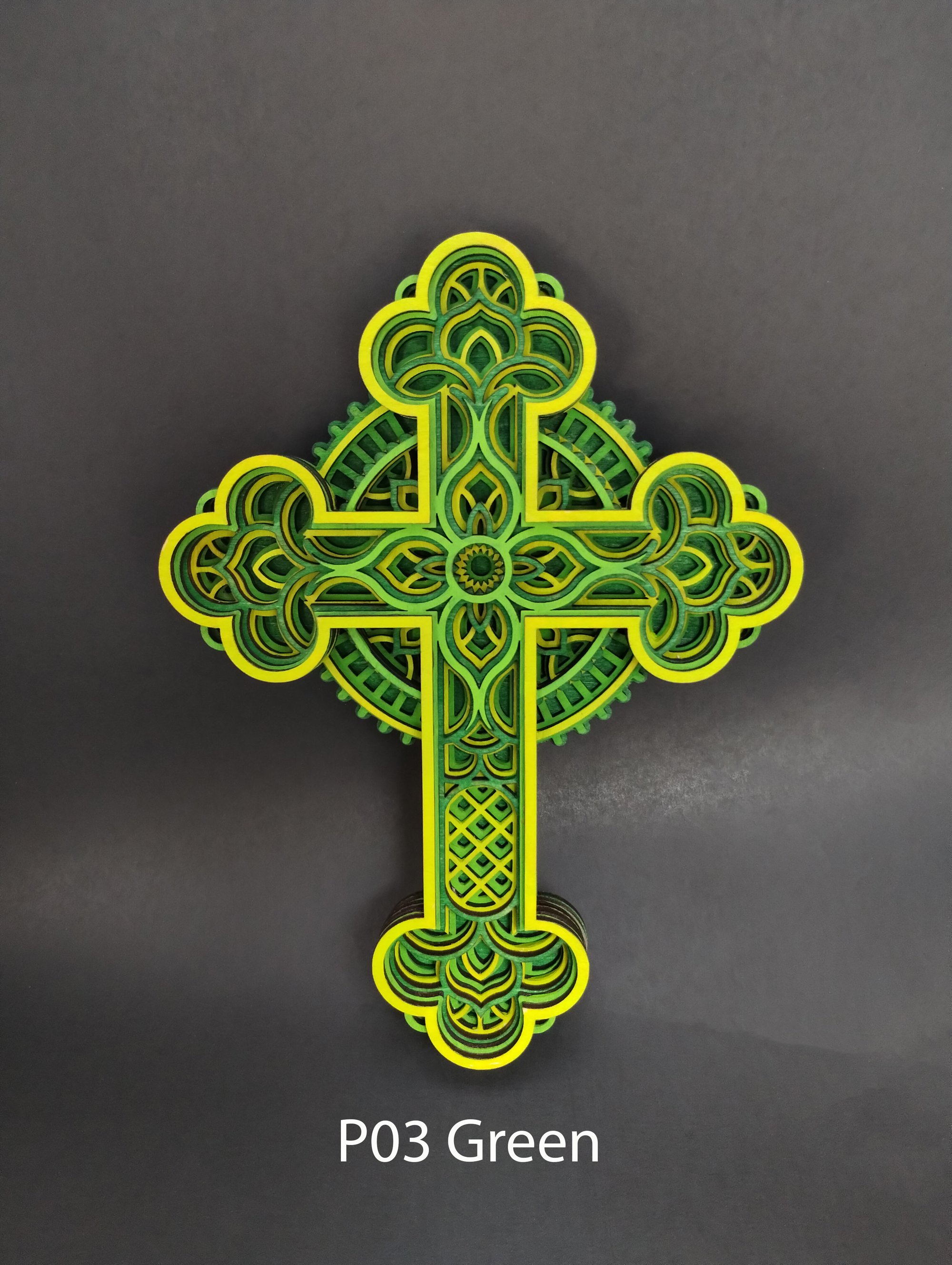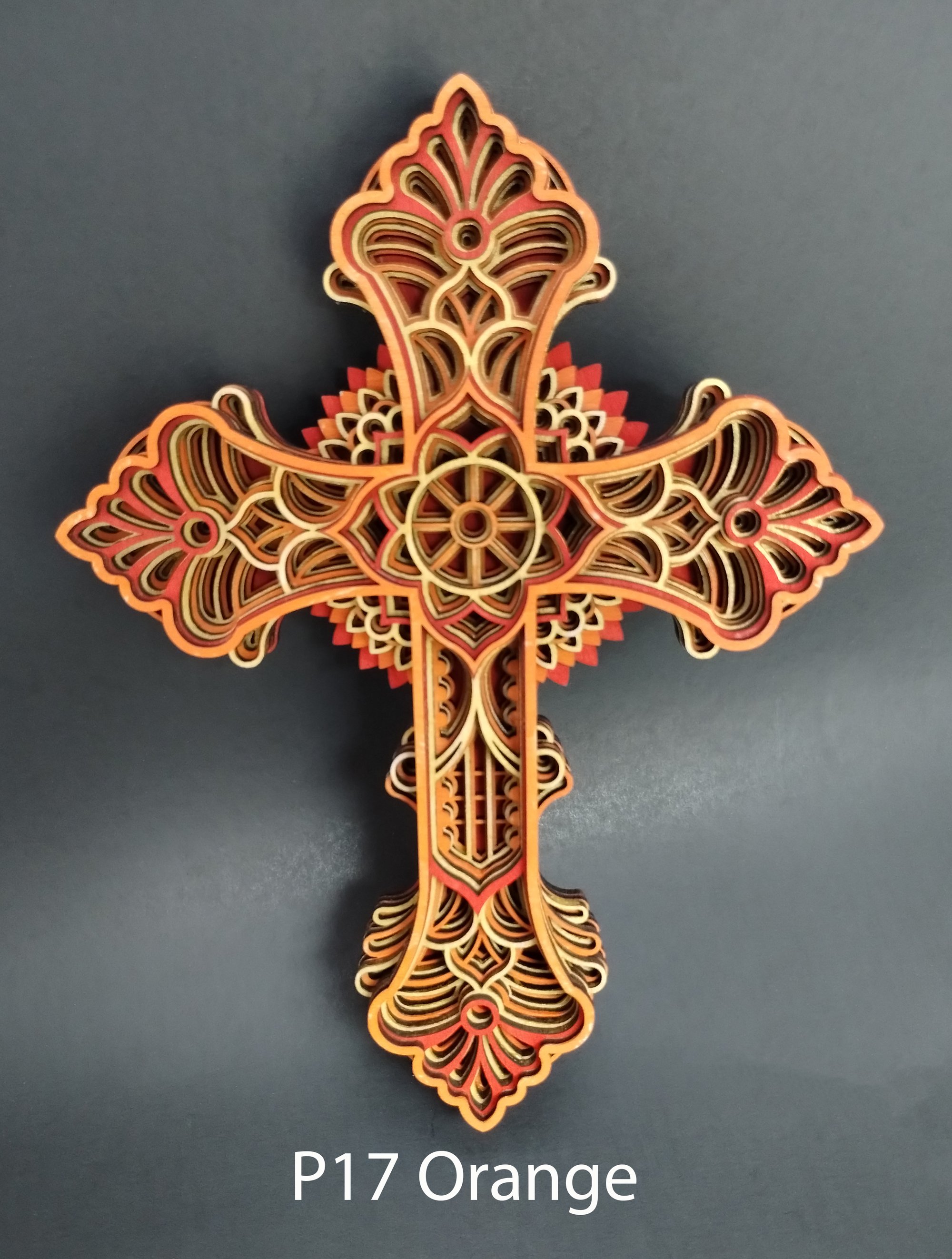 These multi-layered crosses consist of 6 or 7 layers of laser-cut, 3 mm basswood plywood sheets. The layers are hand-painted with 3 different hues to bring out the intricasies of each layer. The blue have 3 different shades of blue. The orange consists of orange, red and gold. The green has 3 different shades of green. Each cross is assembled and glued by hand, one layer at a time. A protective clear coat is then applied.