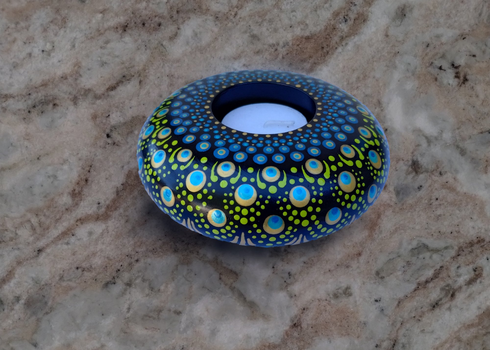 This beautiful hand-painted dot mandala tealight holder features peacock colors of blue, green and gold. This lovely piece is meant to evoke the colorful tail of a peacock. It is hand-cast using a special mortar blend. Then each dot is individually painted by hand. It is sprayed with a protective clear coat. And the bottom is lined with felt to protect your furniture. It can hold any standard tealight, including flameless ones.
