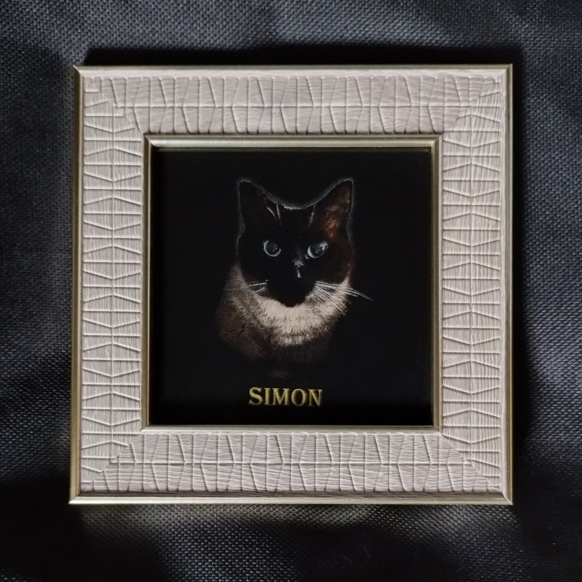 Your pet's portrait is laser-etched on a 4"x4" glass, then colorized. Frame is included for shipping purposes, but my differ from what is pictured. You can transfer the glass portrait to your own frame.
