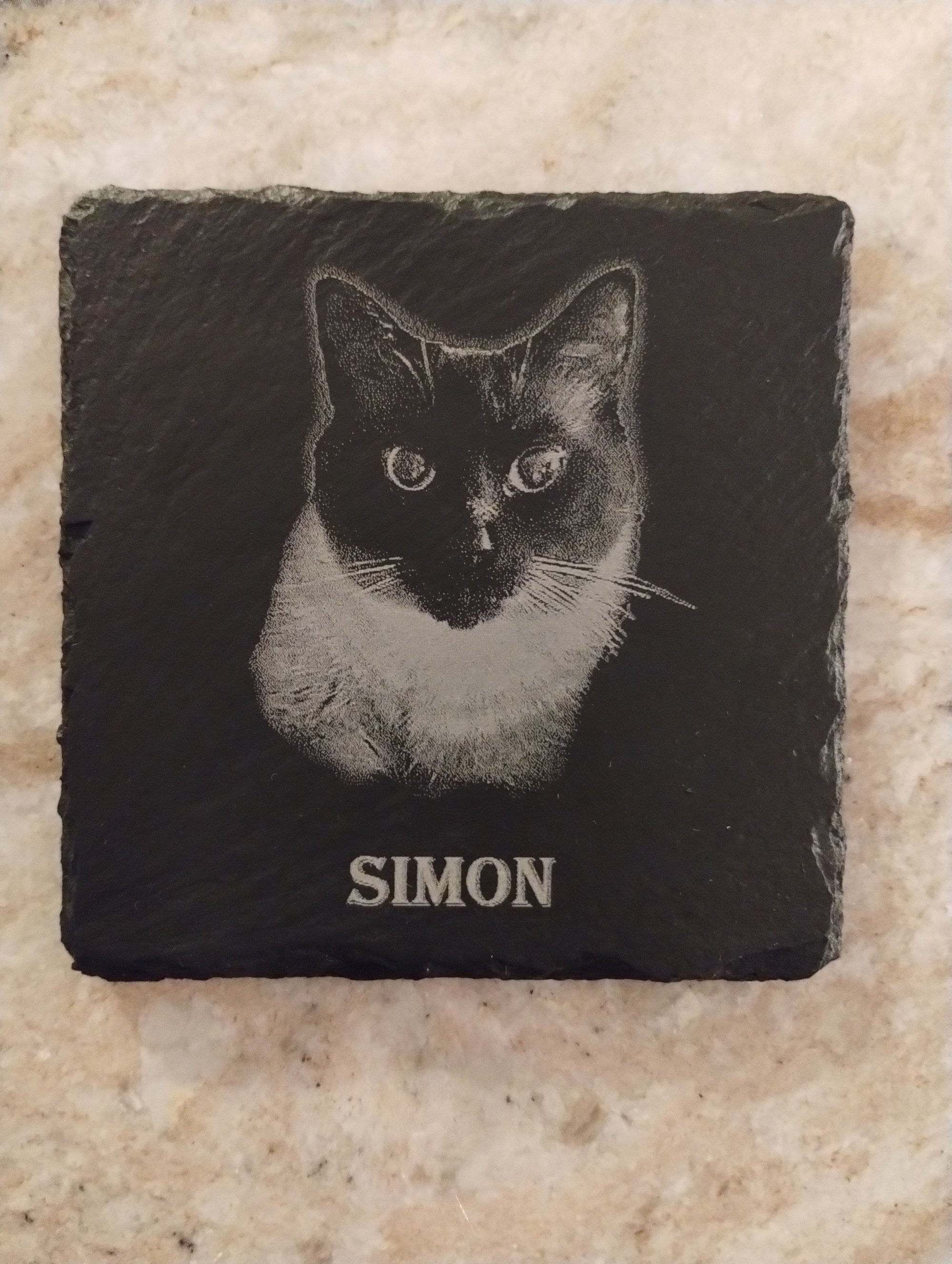 Have your pet's portrait laser engraved on a 4"x4" slate tile. The back has four foam feet, so it can be used at a coaster. Or you can prop it up on a small easel for display. (Display easel not included.)