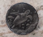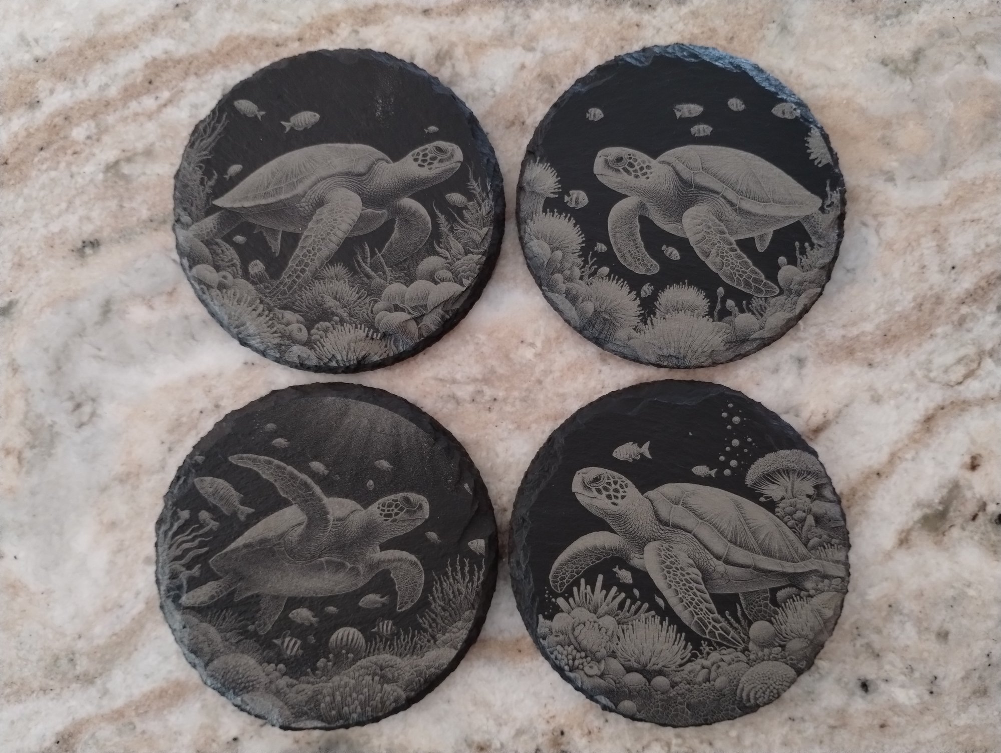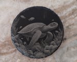 Laser engraved 4" diameter slate coaster with 4 different sea turtle designs. There are foam feet on the bottom.