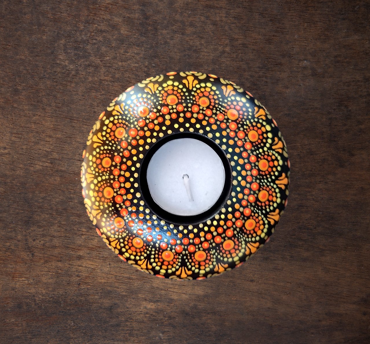 This beautiful hand-painted dot mandala tealight holder features a sun-like radial pattern utilizing the colors of sunshine . This lovely piece will brighten any home with its lively and cheerful colors. It is hand-cast using a special mortar blend. Then each dot is individually painted by hand. It is sprayed with a protective clear coat. And the bottom is lined with felt to protect your furniture. It can hold any standard tealight, including flameless ones.